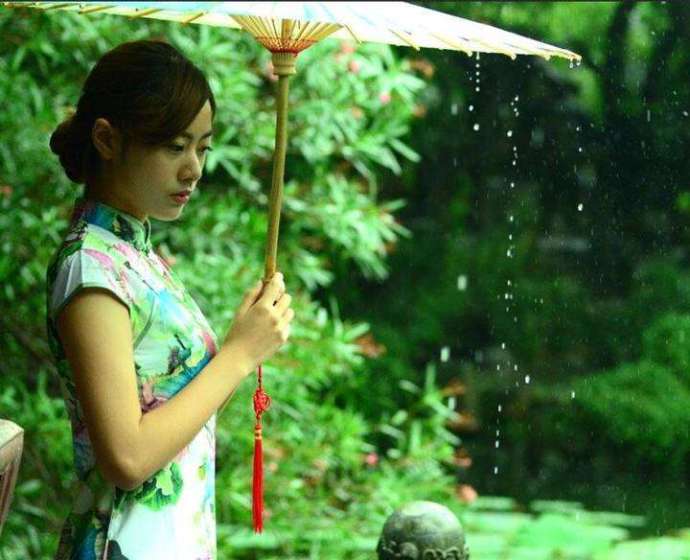 微雨潤,菡萏姱,亭榭典雅境秀婳,榴蕊玉色嫣然雅。香煦帕,舒啜槚,廊下春燕筑巢花,席上樽杯品茶葩。