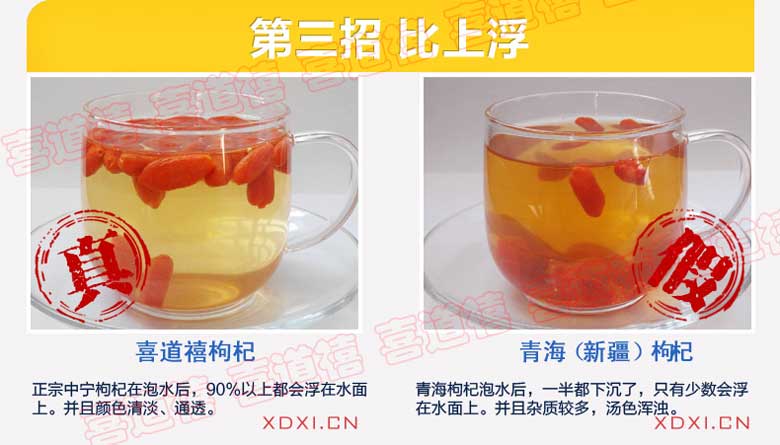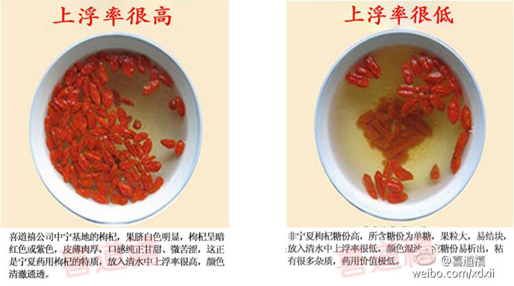■泡水:正宗寧夏枸杞含有適度的枸杞多糖,內(nèi)比重恰到好處。水泡法:將枸杞泡水,看看有沒有下沉,及水色情況;如果發(fā)現(xiàn)大量枸杞下沉,則表示不是寧夏枸杞,如果水色變成鮮紅色,則要注意染色和熏制處理,淡黃色表示正常。