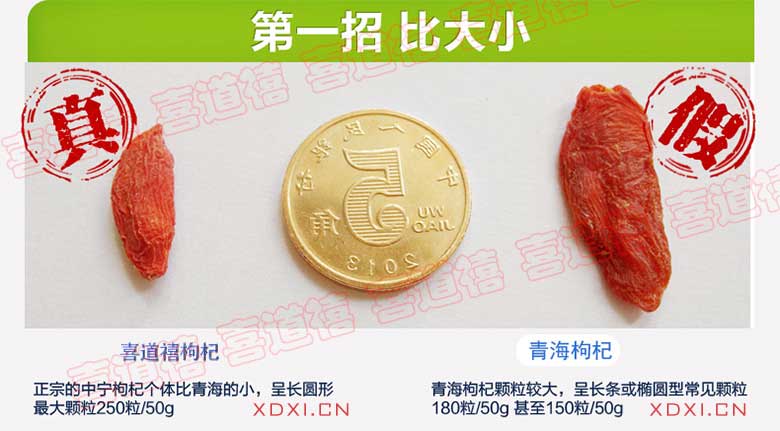 鑒別正品寧夏枸杞可從色澤、形狀、大小、比對、口味、手感和泡水等七個方面進行初步把控甄別。