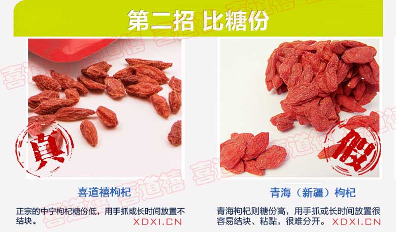 ■手感:正宗寧夏枸杞含有適度的枸杞多糖,掬握一大把干燥的寧夏枸杞干果用力緊攢,然后突然松開手掌,粒粒枸杞跌入盤中叮當脆響,而不會凝結(jié)成一個球團;由于寧夏以外的枸杞含有的是普通單糖果糖,新疆、青海的枸杞含糖量太多,用同樣的方法驗證時,會凝結(jié)成大的球團。如果是上了色素的劣質(zhì)枸杞,看上去很紅艷,可用手蘸點口水撫摸一下此枸杞就會掉色。另外,一般情況下正宗寧夏枸杞不易返潮,保質(zhì)期長一些。