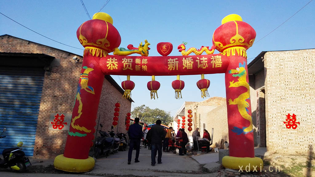 “囍”字,更多地用于婚嫁場合渲染氣氛。囍為兩個喜字相合,含有夫妻恩愛、天長地久之意,囍字自然就成為婚姻的代名詞。在傳統婚俗中,迎親之日,男女雙方各在自家門、街門粘貼大紅囍字,在新婚喜居的街門道口安置大型紅色拱門,門頭上有“新婚誌禧”,赫然醒目。
