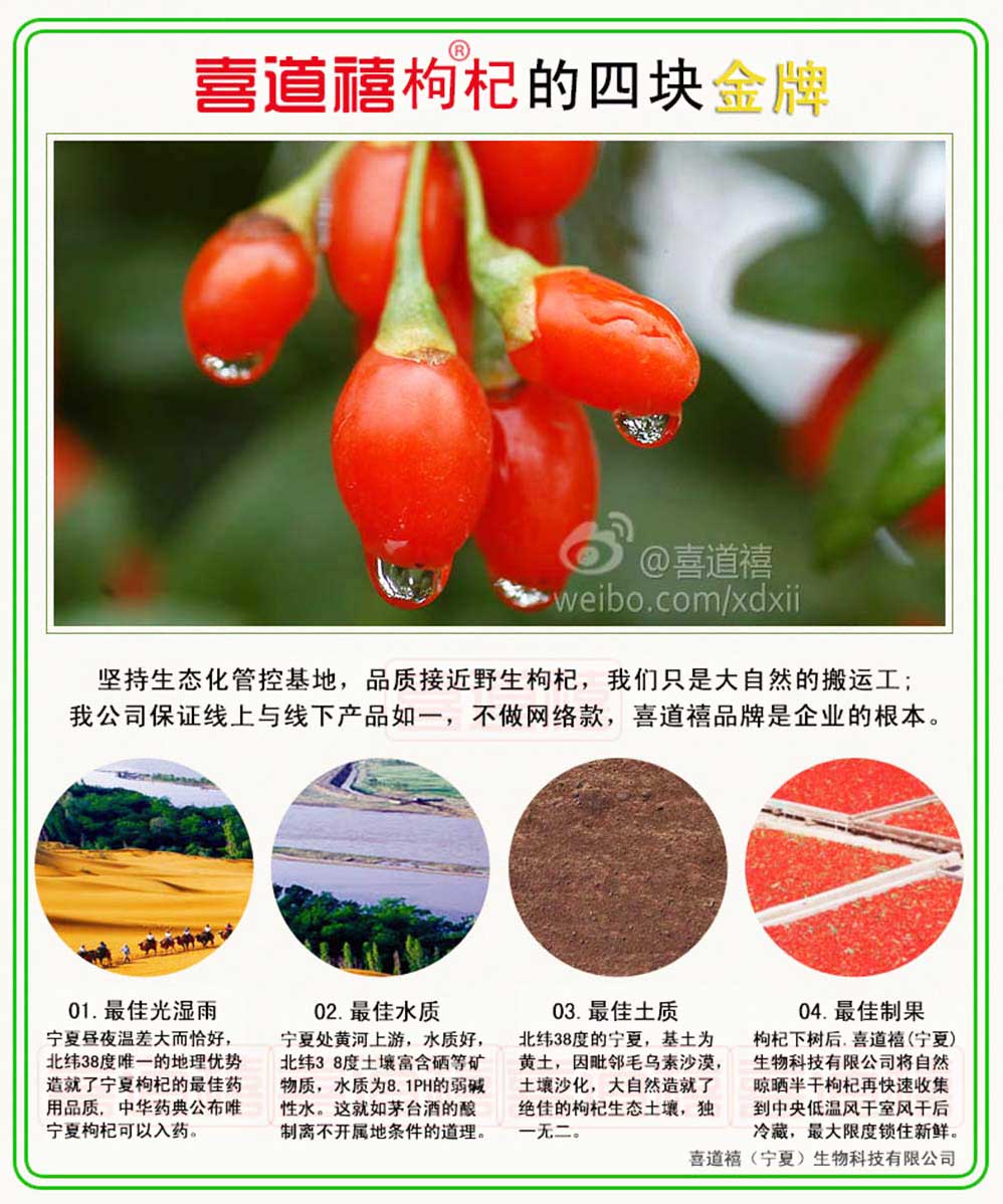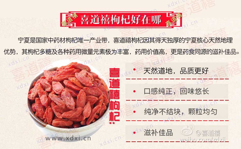 【品鑒一】 喜道禧枸杞,從視覺、口感、味覺、觸覺四維角度品鑒喜道禧好枸杞的色、純、甘、藥、醇、香、勁!先干嘗再濕品,好品質(zhì)就是喜道禧。
